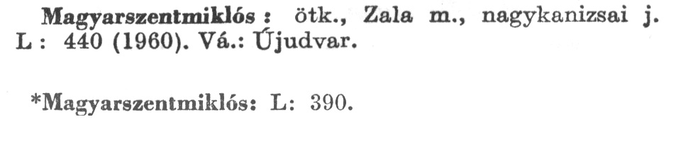 Nyilvános 2567 | 6660 | A szócikkek felismertetett szövege: | (A csillag után az 1972-es kiadású kiegészítő kötetből származó szöveg következik) Magyarszentmiklós: ötk., Zala m., nagykanizsai j. L : 440 (1960). Vá.: Újudvar. *Magyarszentmiklós: L: 390. A szócikkek a következő lexikonból származnak: Cím: Új magyar lexikon Közreműködő: Berei Andor (1900-1979) (szerk.) Szerz. közl.: [szerk. Berei Andor et al.] Kiadás jelzés: 2. lny. Kiadás: Budapest : Akad. K., 1961-1962 Kötetei: 1., A - C 2., D - F 3., G - J 4., K - Me 5., Mf - R 6., S - Z 7. köt., A-Z Kiegészítő kötet (1972) Kiegészítő kötet, 1962÷1980 (1981) ETO jelzet: 03=945.11 Szakjelzet: 030 Cutter: U 28 Nyelv: magyar Megjegyzés: Bibliogr. a címszavak egy részének végén |