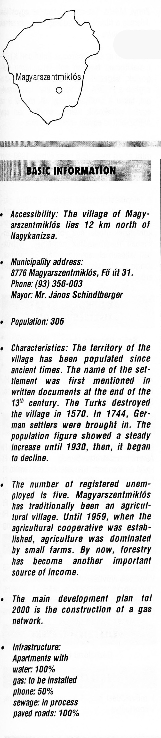 Nyilvános 2633 | 6756 | Magyarszentmiklós | BASIC INFORMATION Accessibility: The village of Magyarszentmiklós lies 12 km north of Nagykanizsa. Municipality address: 8776 Magyarszentmiklós, Fő út 31. Phone: (93) 356-003 Mayor: Mr. János Schindlberger Population: 306 Characteristics: The territory of the village has been populated since ancient times. The name of the settlement was first mentioned in written documents at the end of the 13th century. The Turks destroyed the village in 1570. In 1744, German settlers were brought in. The population figure showed a steady increase until 1930, then, it began to decline. The number of registered unemployed is five. Magyarszentmiklós has traditionally been an agricultural village. Until 1959, when the agricultural cooperative was established, agriculture was dominated by small farms. By now, forestry has become another important source of income. The main development plan tol 2000 is the construction of a gas network. Infrastructure: Apartments with water: 100% gas: to be installed phone: 50% sewage: in process paved roads: 100% This text came from the following book: Title: Handbook of Zala county (Zala megye kézikönyve) Series: County handbooks of Hungary (Magyarország megyei kézikönyvei) Chief editor: Hóbor József Publisher: (Hatvan), CEBA-Hungary Ltd, 1998 ETO: 908.439.121(035) ; 050.8(439.121) ISBN: 963-9089-18-2 Pages: 488-1040 p. Remark: Closed on: 1998. márc. 31. |
