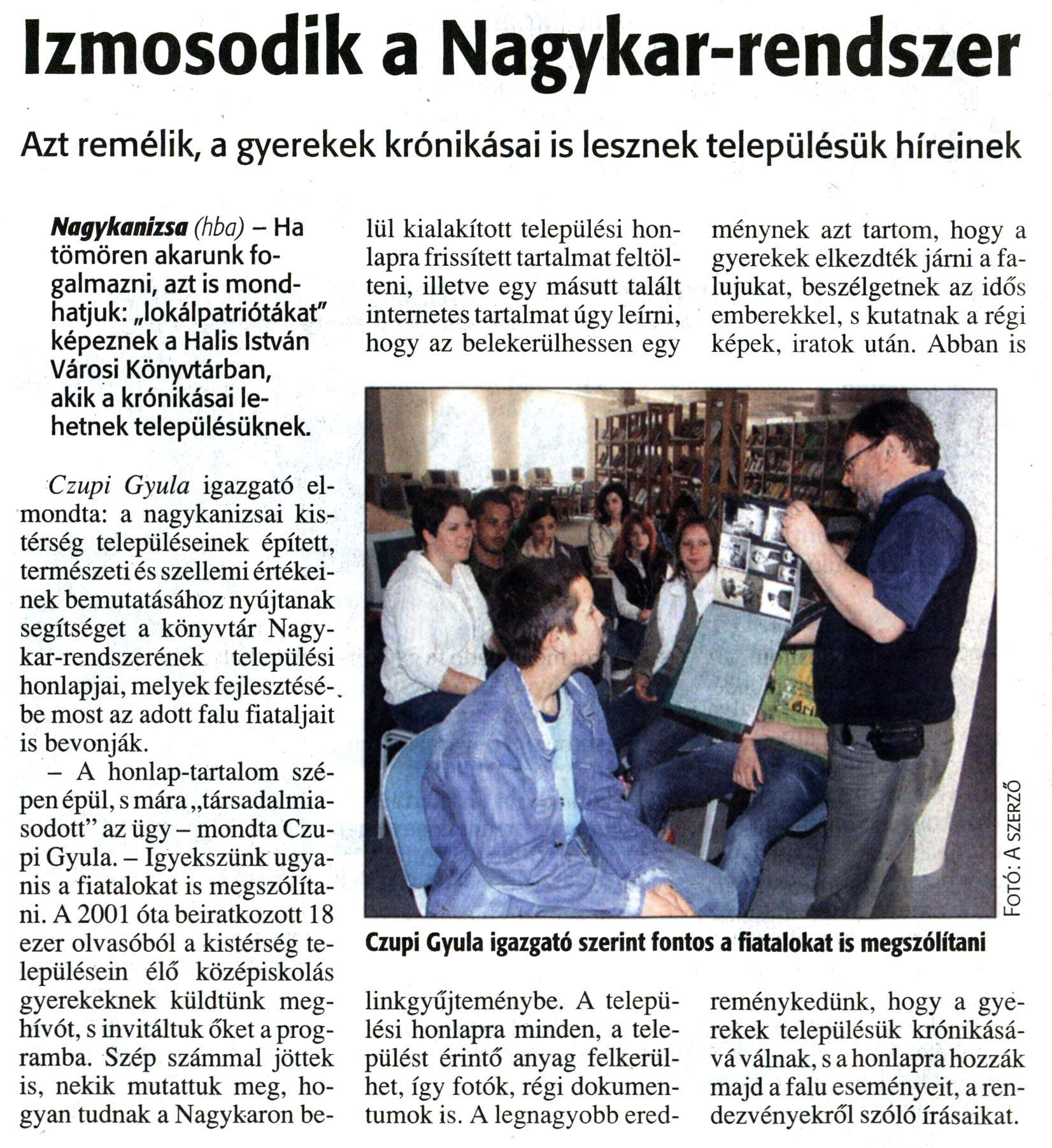 Nyilvános 14612 | 29233 | Zalai Hírlap 2008. június 9. 133. szám 12. oldal - Izmosodik a Nagykar-rendszer | A cikk szövege: Izmosodik a Nagykar-rendszer Azt remélik, a gyerekek krónikásai is lesznek településük híreinek Nagykanizsa (hba) - Ha tömören akarunk fogalmazni, azt is mondhatjuk: „lokálpatriótákat" képeznek a Halis István Városi Könyvtárban, akik a krónikásai lehetnek településüknek. Czupi Gyula igazgató elmondta: a nagykanizsai kistérség településeinek épített, természeti és szellemi értékeinek bemutatásához nyújtanak segítséget a könyvtár Nagykar-rendszerének települési honlapjai, melyek fejlesztésébe most az adott falu fiataljait is bevonják. - A honlap-tartalom szépen épül, s mára „társadalmiasodott" az ügy - mondta Czupi Gyula. - Igyekszünk ugyanis a fiatalokat is megszólítani. A 2001 óta beiratkozott 18 ezer olvasóból a kistérség településein élő középiskolás gyerekeknek küldtünk meghívót, s invitáltuk őket a programba. Szép számmal jöttek is, nekik mutattuk meg, hogyan tudnak a Nagykaron belül kialakított települési honlapra frissített tartalmat feltölteni, illetve egy másutt talált internetes tartalmat úgy leírni, hogy az belekerülhessen egy linkgyűjteménybe. A települési honlapra minden, a települést érintő anyag felkerülhet, így fotók, régi dokumentumok is. A legnagyobb eredménynek azt tartom, hogy a gyerekek elkezdték járni a falujukat, beszélgetnek az idős emberekkel, s kutatnak a régi képek, iratok után. Abban is reménykedünk, hogy a gyerekek településük krónikásává válnak, s a honlapra hozzák majd a falu eseményeit, a rendezvényekről szóló írásaikat. Képaláírás: Czupi Gyula igazgató szerint fontos a fiatalokat is megszólítani |